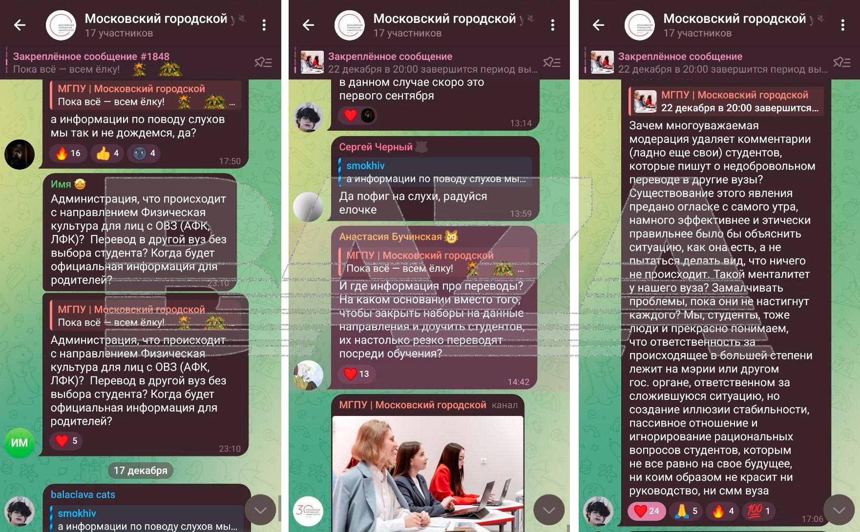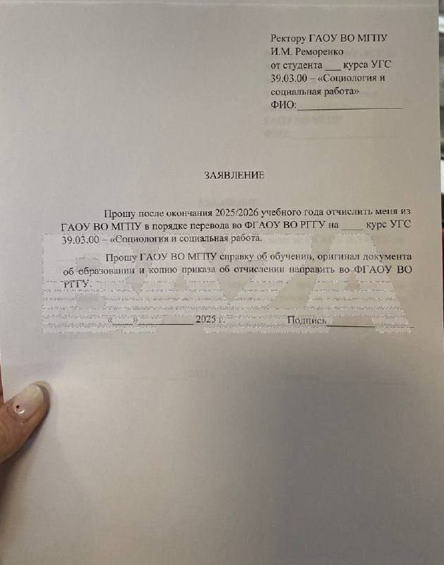 Студентам этих направлений предложили «добровольно» перевестись в другие вузы или уйти из МГПУ: на встрече с руководством вуза им выдали готовые бланки заявлений на отчисление «по собственному желанию». Многие студенты возмущены и считают, что вуз мог просто прекратить прием на эти специальности и позволить им завершить обучение.